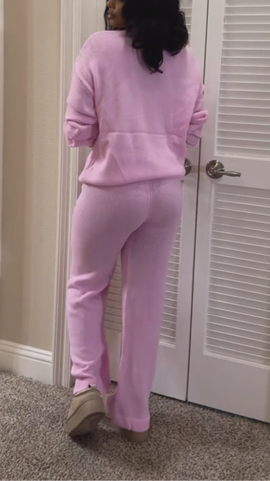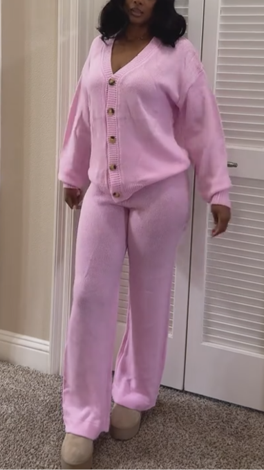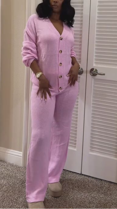 Solid Color V-neck Cardigan And Elastic Waist Wide-leg Pants Two-piece Set